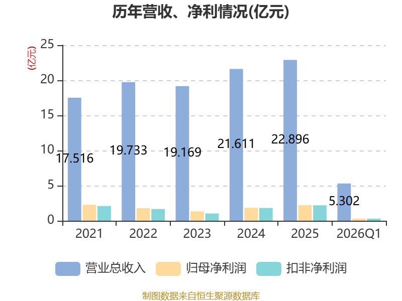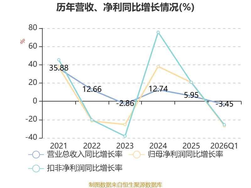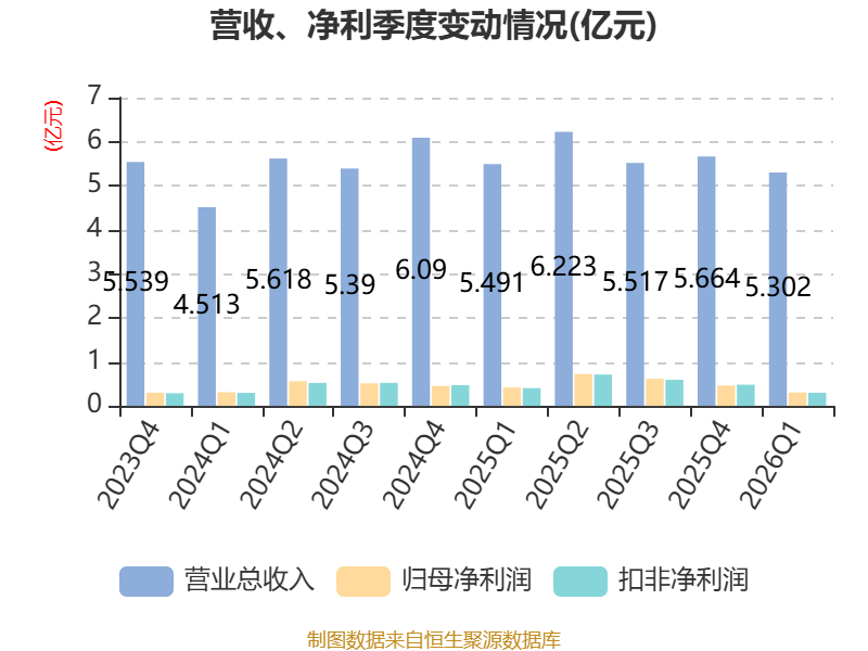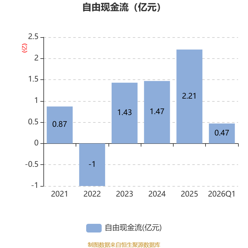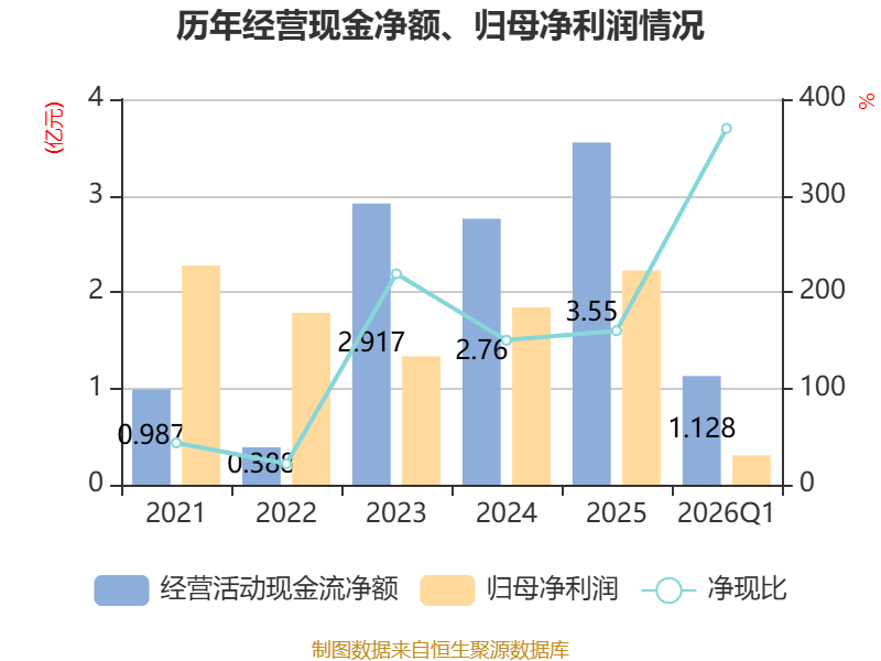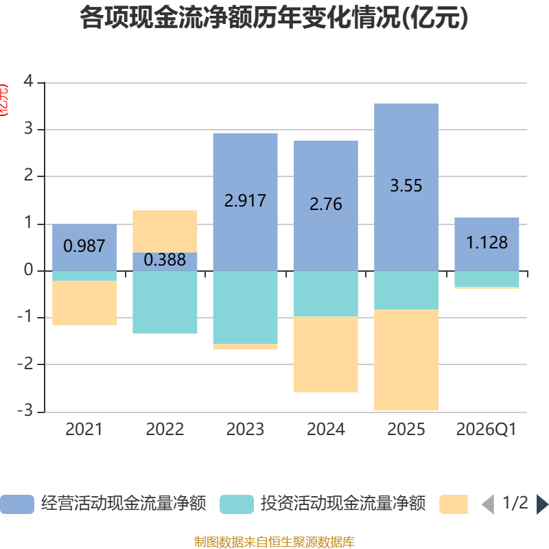 截至2026年一季度末,公司经营活动现金流净额为1.13亿元,同比增加1.13亿元;筹资活动现金流净额-369.42万元,同比减少414.86万元;投资活动现金流净额-3475.77万元,上年同期为-792.2万元。