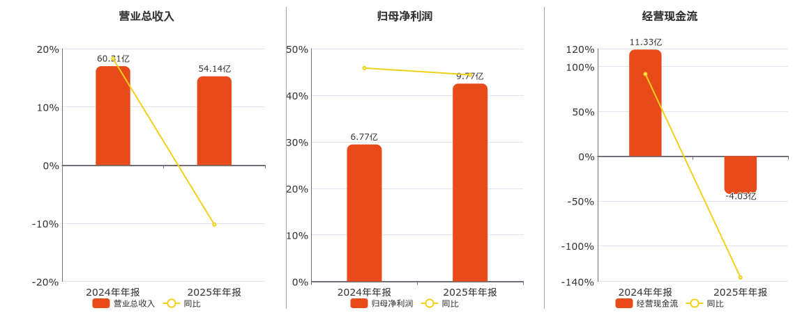 公司营业总收入为54.14亿元,较去年同报告期营业总收入减少6.17亿元,同比较去年同期下降10.22%。归母净利润为9.77亿元。经营活动现金净流入为-4.03亿元,较去年同报告期经营活动现金净流入减少15.36亿元,同比较去年同期下降135.57%。