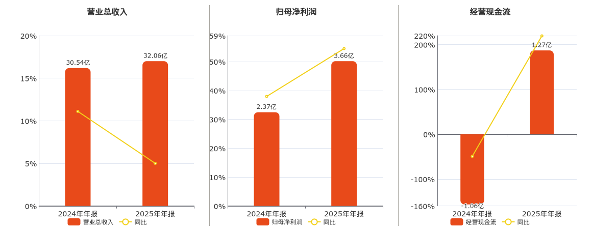 公司营业总收入为32.06亿元。归母净利润为3.66亿元。经营活动现金净流入为1.27亿元。