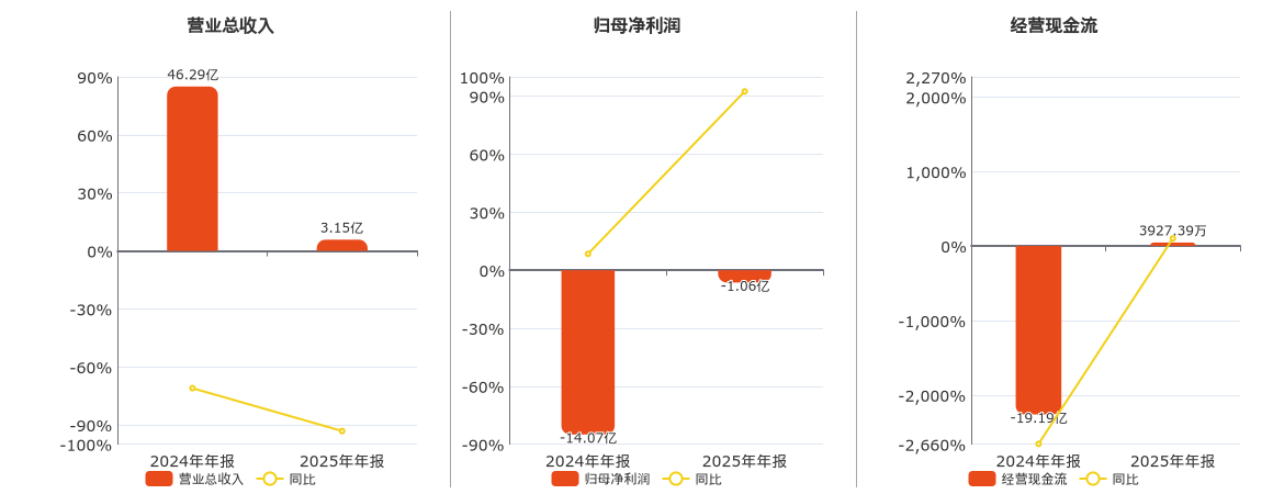公司营业总收入为3.15亿元。归母净利润为-1.06亿元,较去年同报告期归母净利润增加13.01亿元,实现3年连续上涨。经营活动现金净流入为3927.39万元,较去年同报告期经营活动现金净流入增加19.58亿元。