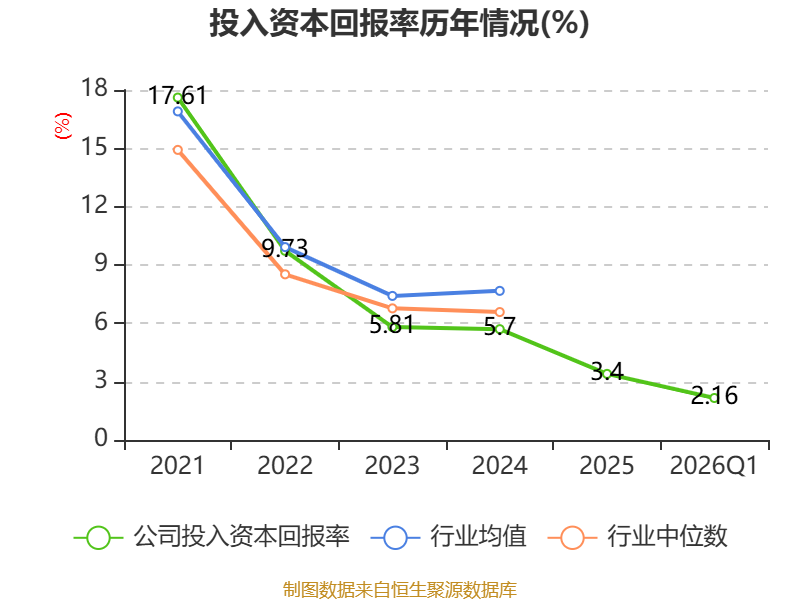 盈利能力方面, 2026年一季度公司加权平均净资产收益率为2.46%,同比上升0.79个百分点。公司2026年第一季度投入资本回报率为2.16%,较上年同期上升0.76个百分点。