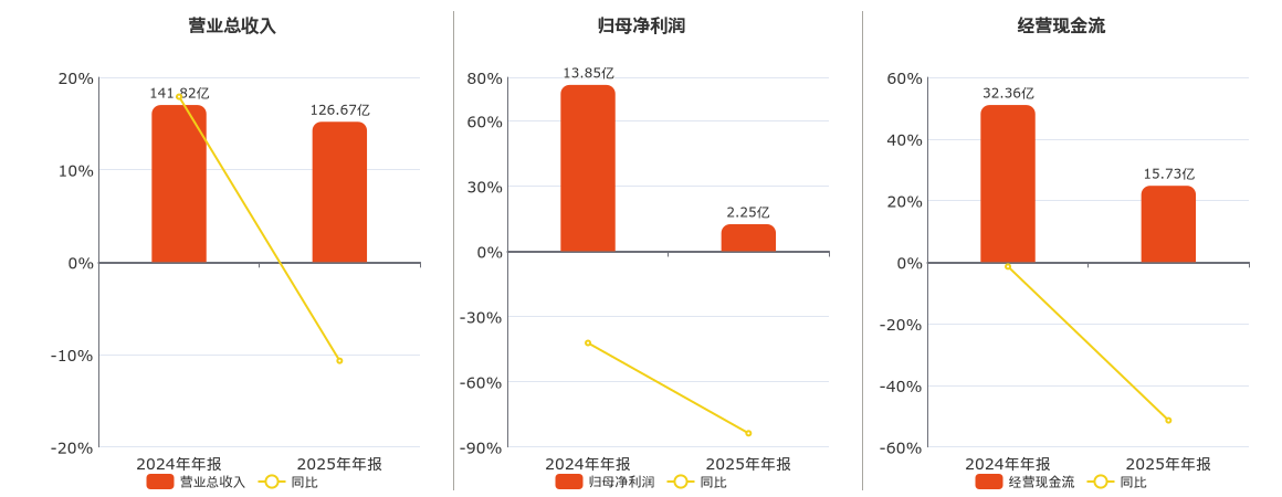 公司营业总收入为126.67亿元,在已披露的同业公司中排名第9,较去年同报告期营业总收入减少15.15亿元,同比较去年同期下降10.68%。归母净利润为2.25亿元,在已披露的同业公司中排名第9,较去年同报告期归母净利润减少11.60亿元,同比较去年同期下降83.74%。经营活动现金净流入为15.73亿元,在已披露的同业公司中排名第9,较去年同报告期经营活动现金净流入减少16.63亿元,同比较去年同期下降51.38%。