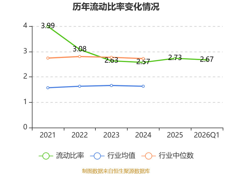 2026年第一季度,公司流动比率为2.67,速动比率为2.33。
