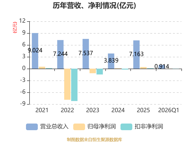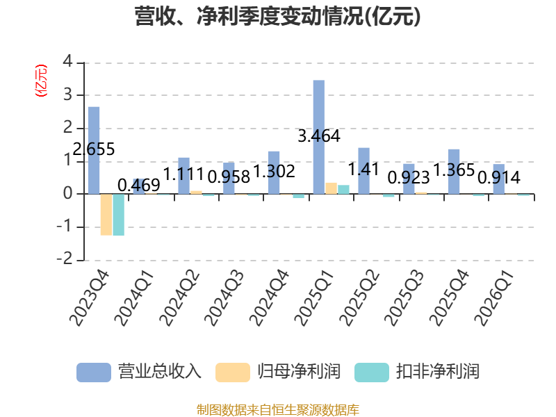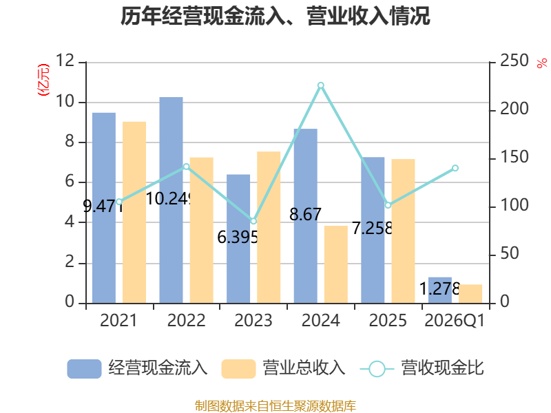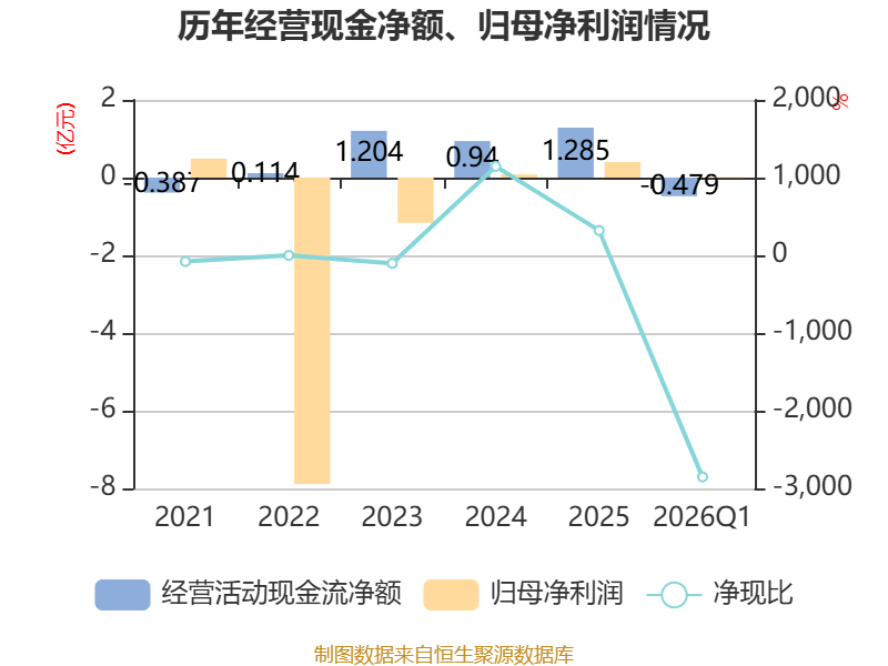 截至2026年一季度末,公司经营活动现金流净额为-4790.93万元,同比减少3369.4万元;筹资活动现金流净额1918.46万元,同比增加5001.5万元;投资活动现金流净额-282.22万元,上年同期为-6844.13万元。