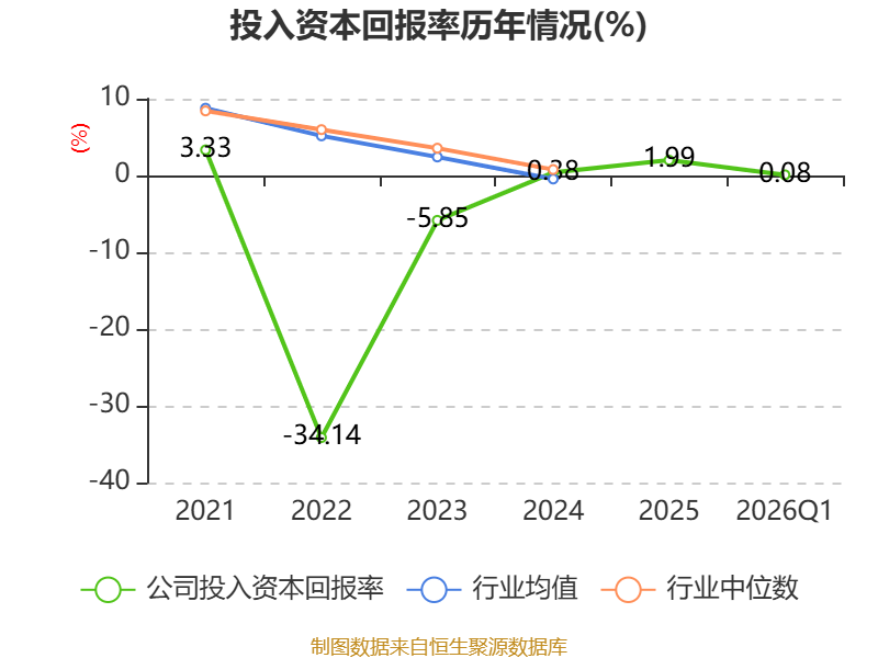 盈利能力方面, 2026年一季度公司加权平均净资产收益率为0.1%,同比下降1.92个百分点。公司2026年第一季度投入资本回报率为0.08%,较上年同期下降1.91个百分点。