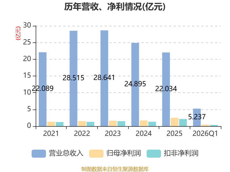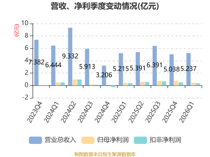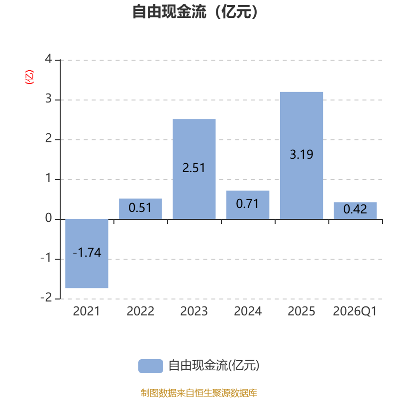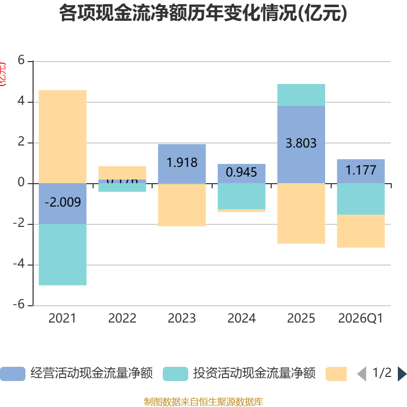 截至2026年一季度末,公司经营活动现金流净额为1.18亿元,同比下降0.84%;筹资活动现金流净额-1.61亿元,同比减少1.76亿元;投资活动现金流净额-1.56亿元,上年同期为-782.41万元。