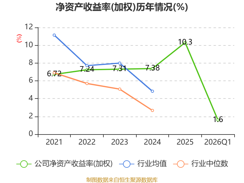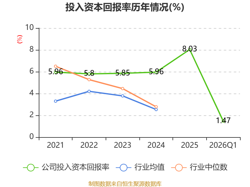 盈利能力方面, 2026年一季度公司加权平均净资产收益率为1.6%,同比下降0.12个百分点。公司2026年第一季度投入资本回报率为1.47%,较上年同期上升0.03个百分点。