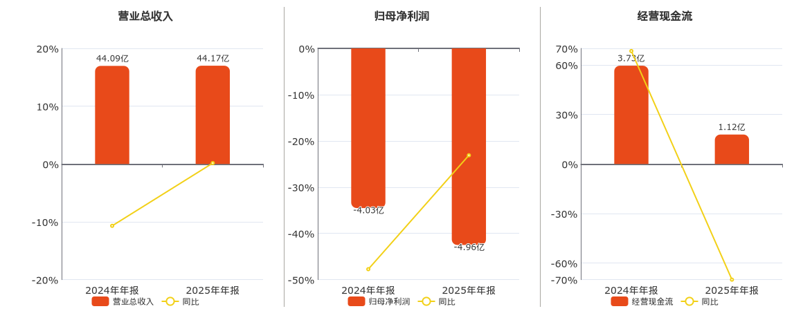 公司营业总收入为44.17亿元,较去年同报告期营业总收入增加713.82万元,同比较去年同期上涨0.16%。归母净利润为-4.96亿元,较去年同报告期归母净利润减少9302.51万元。经营活动现金净流入为1.12亿元,较去年同报告期经营活动现金净流入减少2.61亿元,同比较去年同期下降70.00%。