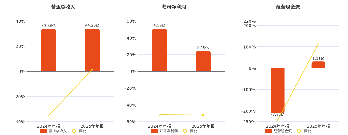 公司营业总收入为44.20亿元,在已披露的同业公司中排名第21,较去年同报告期营业总收入增加5193.30万元,同比较去年同期上涨1.19%。归母净利润为2.19亿元,在已披露的同业公司中排名第13,较去年同报告期归母净利润减少2.40亿元,同比较去年同期下降52.33%。经营活动现金净流入为1.11亿元,在已披露的同业公司中排名第25,较去年同报告期经营活动现金净流入增加8.93亿元。