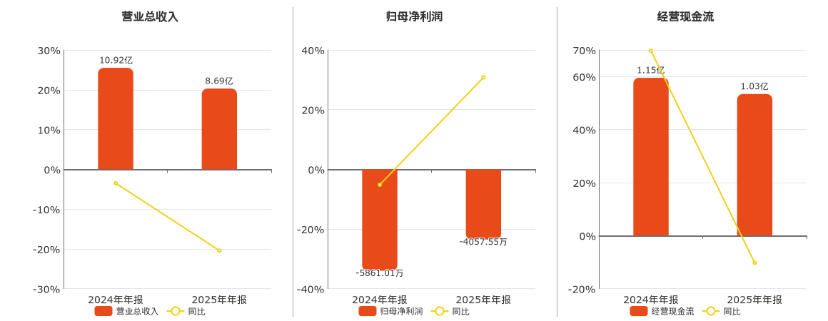 公司营业总收入为8.69亿元,较去年同报告期营业总收入减少2.23亿元,同比较去年同期下降20.43%。归母净利润为-4057.55万元。经营活动现金净流入为1.03亿元,较去年同报告期经营活动现金净流入减少1179.17万元,同比较去年同期下降10.28%。