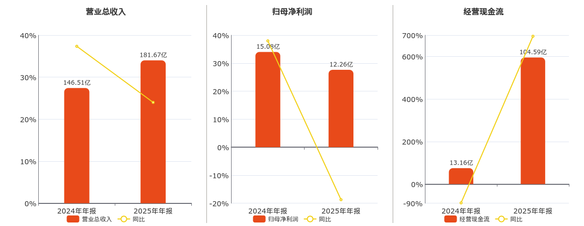 公司营业总收入为181.67亿元,在已披露的同业公司中排名第9,较去年同报告期营业总收入增加35.16亿元,实现2年连续上涨,同比较去年同期上涨24.00%。归母净利润为12.26亿元,在已披露的同业公司中排名第1,较去年同报告期归母净利润减少2.83亿元,同比较去年同期下降18.74%。经营活动现金净流入为104.59亿元,在已披露的同业公司中排名第3,较去年同报告期经营活动现金净流入增加91.43亿元,同比较去年同期上涨694.84%。