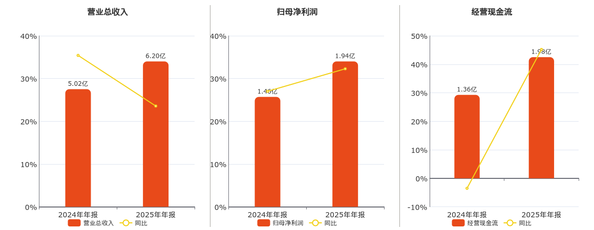 公司营业总收入为6.20亿元。归母净利润为1.94亿元。经营活动现金净流入为1.98亿元。
