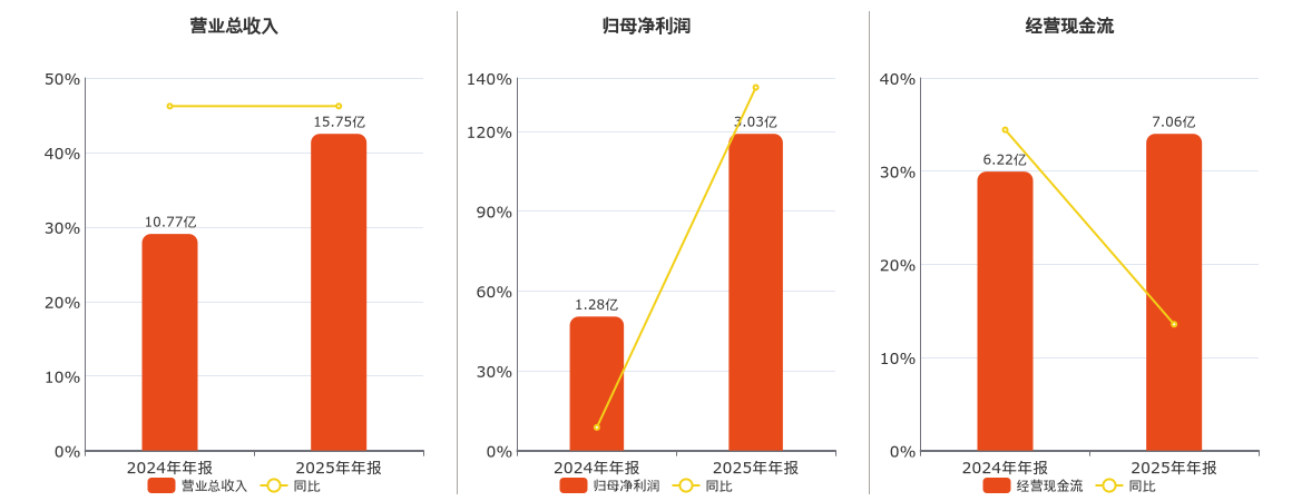 公司营业总收入为15.75亿元,在已披露的同业公司中排名第57。归母净利润为3.03亿元。经营活动现金净流入为7.06亿元。