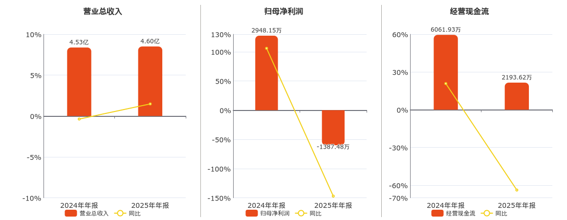 公司营业总收入为4.60亿元。归母净利润为-1387.48万元,较去年同报告期归母净利润减少4335.63万元,同比较去年同期下降147.06%。经营活动现金净流入为2193.62万元,较去年同报告期经营活动现金净流入减少3868.31万元,同比较去年同期下降63.81%。