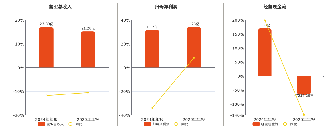 公司营业总收入为21.28亿元,较去年同报告期营业总收入减少2.52亿元,同比较去年同期下降10.57%。归母净利润为1.23亿元。经营活动现金净流入为-7234.20万元,较去年同报告期经营活动现金净流入减少2.55亿元,同比较去年同期下降139.55%。