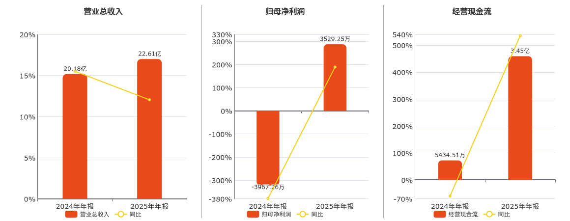 公司营业总收入为22.61亿元。归母净利润为3529.25万元。经营活动现金净流入为3.45亿元。