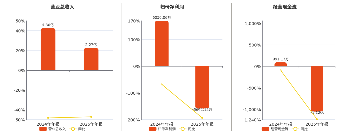 公司营业总收入为2.27亿元,较去年同报告期营业总收入减少2.03亿元,同比较去年同期下降47.21%。归母净利润为-5642.12万元,较去年同报告期归母净利润减少1.17亿元,同比较去年同期下降193.57%。经营活动现金净流入为-1.12亿元,较去年同报告期经营活动现金净流入减少1.22亿元,同比较去年同期下降1231.90%。