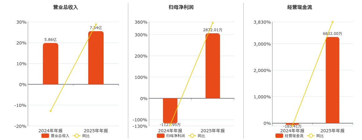 公司营业总收入为7.54亿元。归母净利润为2872.01万元。经营活动现金净流入为6832.00万元。