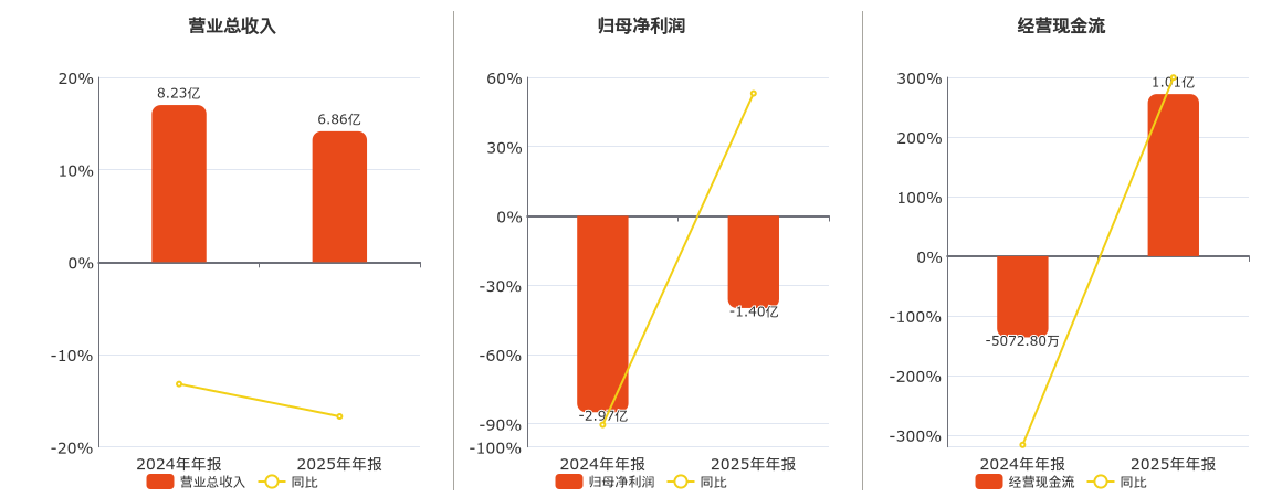 公司营业总收入为6.86亿元,较去年同报告期营业总收入减少1.37亿元,同比较去年同期下降16.70%。归母净利润为-1.40亿元。经营活动现金净流入为1.01亿元。
