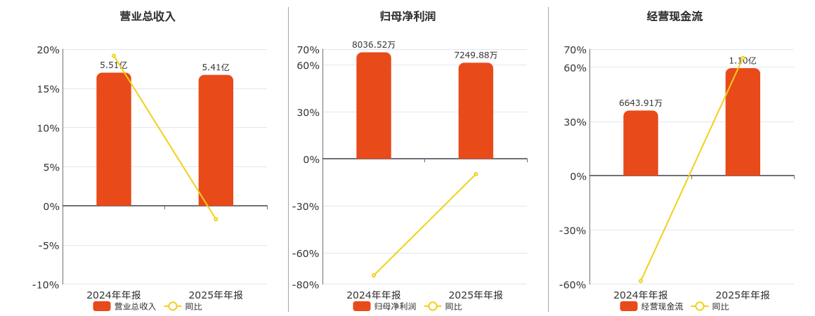 公司营业总收入为5.41亿元,较去年同报告期营业总收入减少939.61万元,同比较去年同期下降1.71%。归母净利润为7249.88万元,较去年同报告期归母净利润减少786.65万元,同比较去年同期下降9.79%。经营活动现金净流入为1.10亿元。