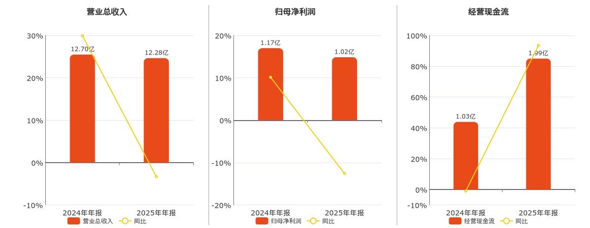 公司营业总收入为12.28亿元,较去年同报告期营业总收入减少4209.04万元,同比较去年同期下降3.32%。归母净利润为1.02亿元,较去年同报告期归母净利润减少1464.53万元,同比较去年同期下降12.57%。经营活动现金净流入为1.99亿元。