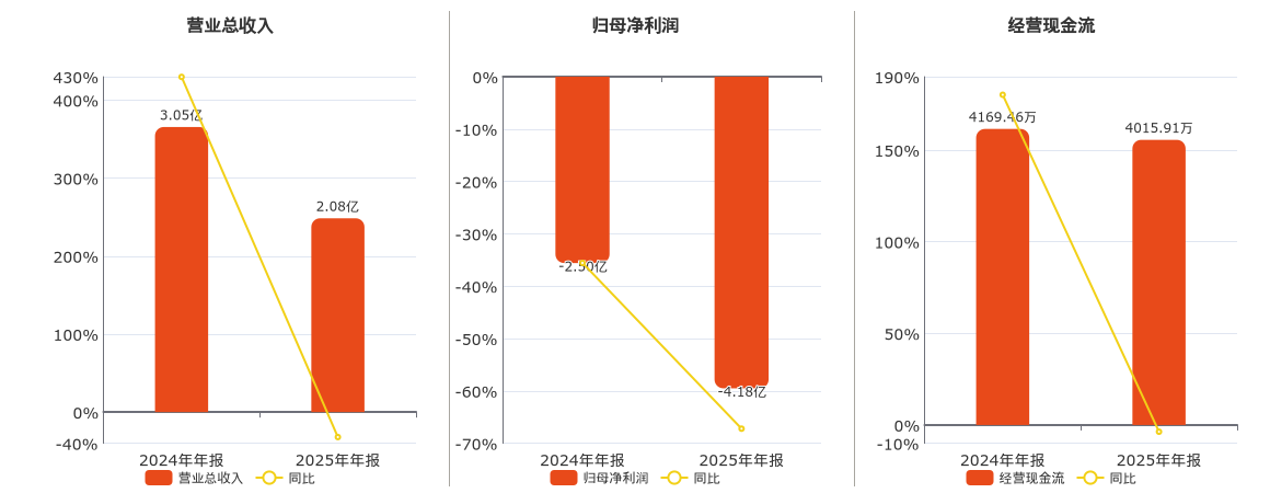公司营业总收入为2.08亿元,在已披露的同业公司中排名第50,较去年同报告期营业总收入减少9776.56万元,同比较去年同期下降32.02%。归母净利润为-4.18亿元,在已披露的同业公司中排名第39,较去年同报告期归母净利润减少1.68亿元。经营活动现金净流入为4015.91万元,在已披露的同业公司中排名第30,较去年同报告期经营活动现金净流入减少153.54万元,同比较去年同期下降3.68%。