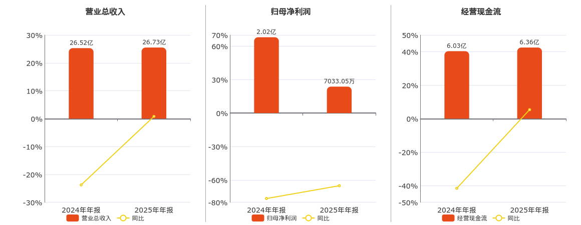 公司营业总收入为26.73亿元。归母净利润为7033.05万元,在已披露的同业公司中排名第21,较去年同报告期归母净利润减少1.31亿元,同比较去年同期下降65.12%。经营活动现金净流入为6.36亿元。