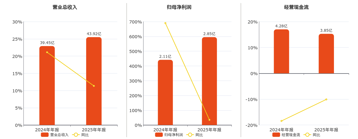 公司营业总收入为43.92亿元。归母净利润为2.85亿元。经营活动现金净流入为3.85亿元,较去年同报告期经营活动现金净流入减少4323.77万元,同比较去年同期下降10.10%。