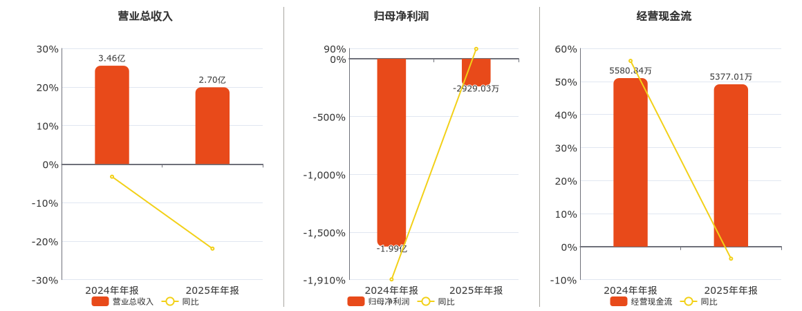 公司营业总收入为2.70亿元,较去年同报告期营业总收入减少7604.98万元,同比较去年同期下降21.95%。归母净利润为-2929.03万元。经营活动现金净流入为5377.01万元,较去年同报告期经营活动现金净流入减少203.83万元,同比较去年同期下降3.65%。