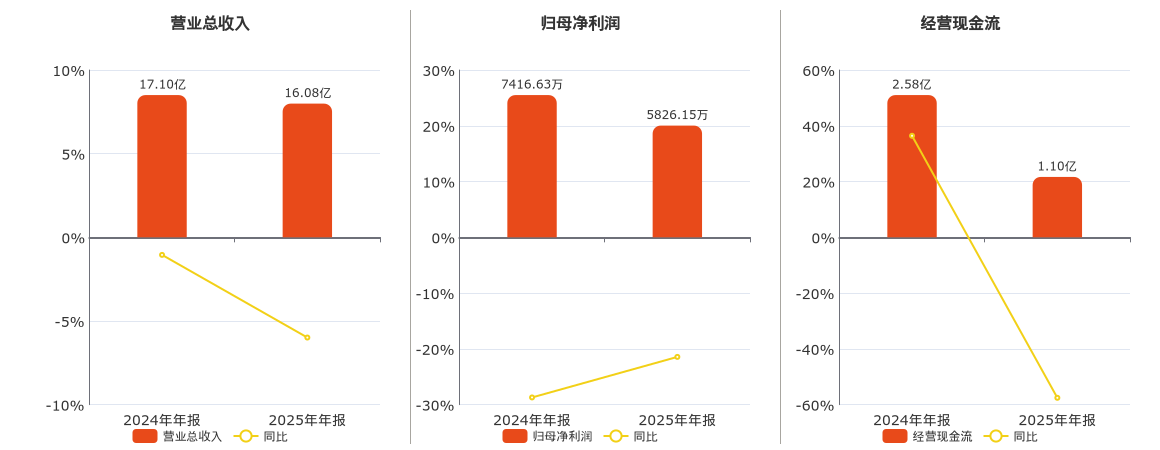 公司营业总收入为16.08亿元,在已披露的同业公司中排名第22,较去年同报告期营业总收入减少1.03亿元,同比较去年同期下降5.99%。归母净利润为5826.15万元,在已披露的同业公司中排名第24,较去年同报告期归母净利润减少1590.48万元,同比较去年同期下降21.44%。经营活动现金净流入为1.10亿元,在已披露的同业公司中排名第20,较去年同报告期经营活动现金净流入减少1.49亿元,同比较去年同期下降57.55%。