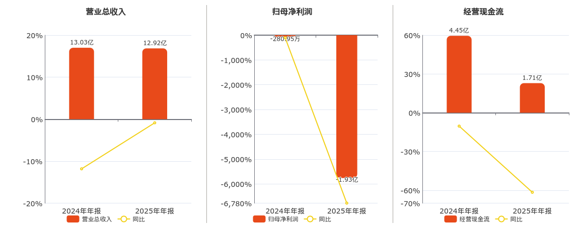 公司营业总收入为12.92亿元,较去年同报告期营业总收入减少8719.50万元,同比较去年同期下降6.32%。归母净利润为-1.93亿元,较去年同报告期归母净利润减少1.96亿元,同比较去年同期下降7633.92%。经营活动现金净流入为1.71亿元,较去年同报告期经营活动现金净流入减少2.94亿元,同比较去年同期下降63.20%。