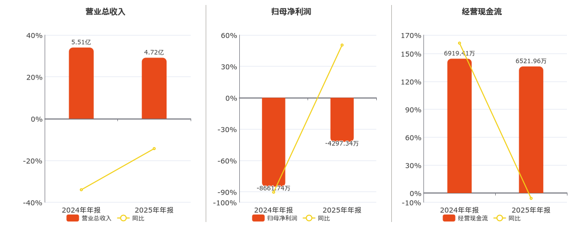 公司营业总收入为4.72亿元。归母净利润为-4297.34万元,较去年同报告期归母净利润增加4364.40万元。经营活动现金净流入为6521.96万元。