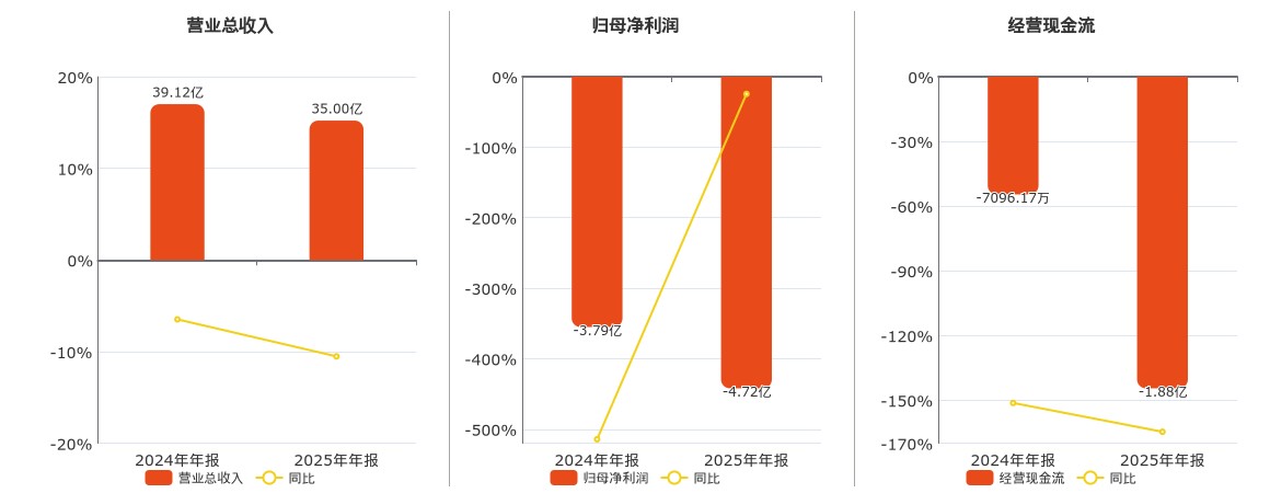公司营业总收入为35.00亿元,较去年同报告期营业总收入减少4.12亿元,同比较去年同期下降10.52%。归母净利润为-4.72亿元,较去年同报告期归母净利润减少9280.94万元。经营活动现金净流入为-1.88亿元,较去年同报告期经营活动现金净流入减少1.17亿元。
