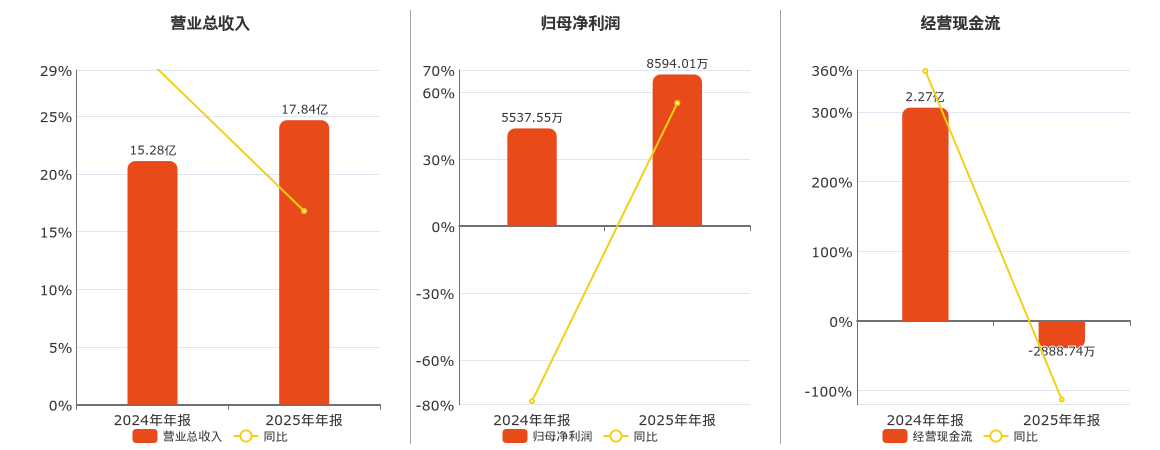 公司营业总收入为17.84亿元,在已披露的同业公司中排名第11。归母净利润为8594.01万元,在已披露的同业公司中排名第11。经营活动现金净流入为-2888.74万元,在已披露的同业公司中排名第18,较去年同报告期经营活动现金净流入减少2.56亿元,同比较去年同期下降112.73%。