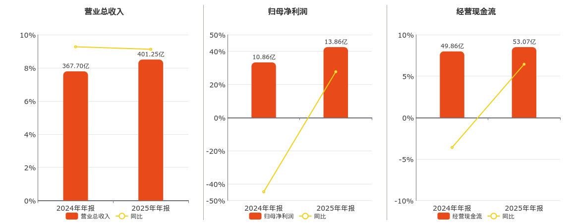 公司营业总收入为401.25亿元。归母净利润为13.86亿元。经营活动现金净流入为53.07亿元。