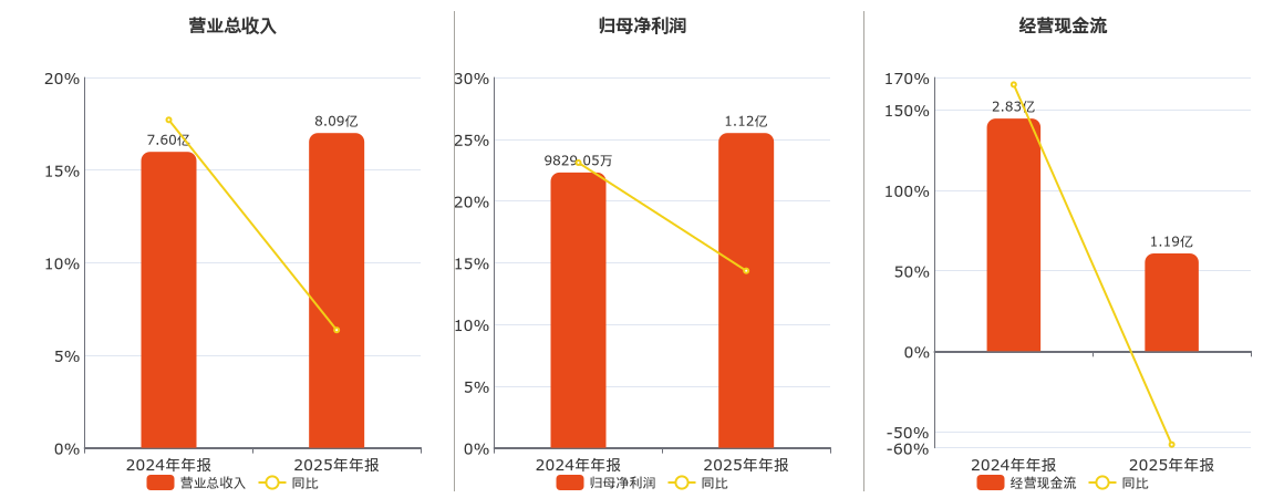 公司营业总收入为8.09亿元。归母净利润为1.12亿元。经营活动现金净流入为1.19亿元,较去年同报告期经营活动现金净流入减少1.64亿元,同比较去年同期下降57.98%。