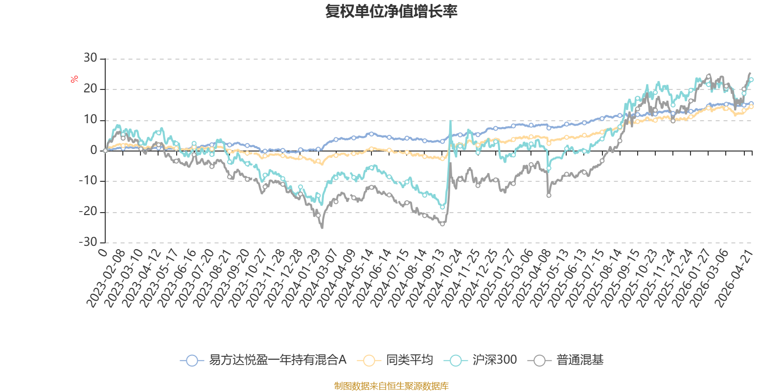 截至4月21日,易方达悦盈一年持有混合A近三个月复权单位净值增长率为1.35%,位于同类可比基金134/629;近半年复权单位净值增长率为3.13%,位于同类可比基金225/629;近一年复权单位净值增长率为7.21%,位于同类可比基金328/629;近三年复权单位净值增长率为14.49%,位于同类可比基金223/582。