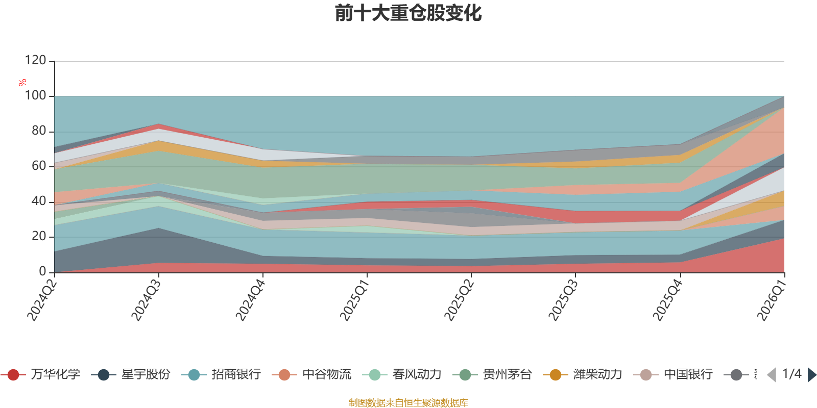 该基金持股集中度较高,近2年前十大重仓股集中度长期超过60%。截至2026年一季度末,基金重仓股分别是宁德时代、万华化学、长江电力、星宇股份、潍柴动力、中谷物流、宝丰能源、生益科技。