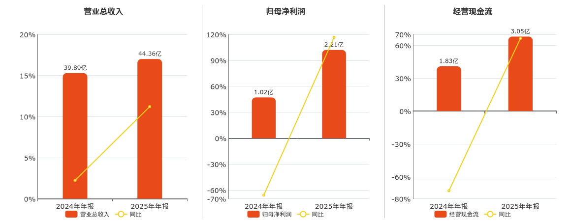 公司营业总收入为44.36亿元。归母净利润为2.21亿元。经营活动现金净流入为3.05亿元。