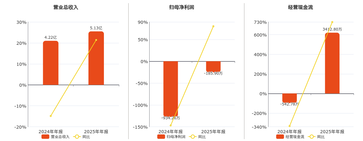 公司营业总收入为5.13亿元。归母净利润为-185.90万元。经营活动现金净流入为3412.80万元。