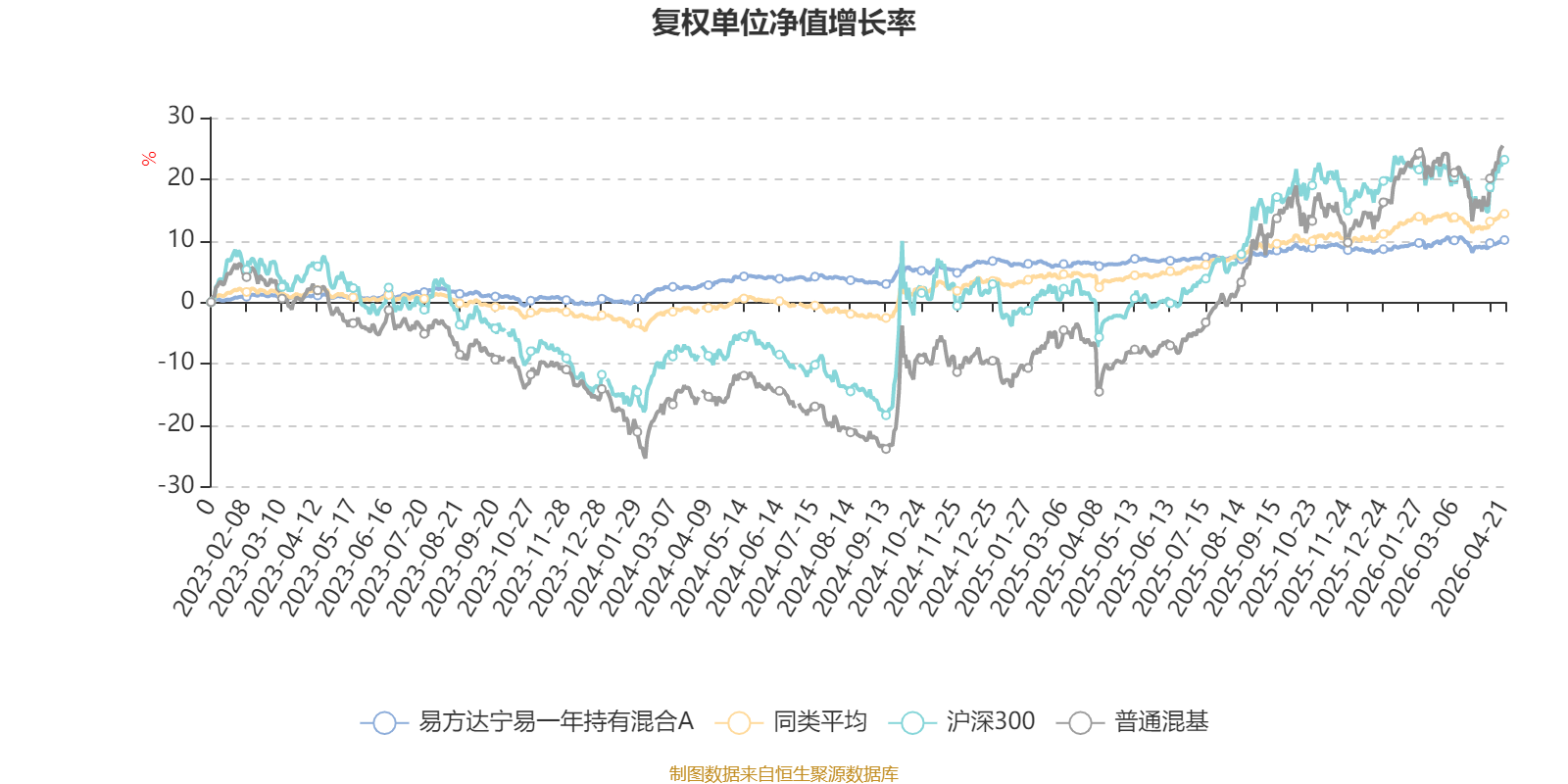 截至4月21日,易方达宁易一年持有混合A近三个月复权单位净值增长率为0.63%,位于同类可比基金243/629;近半年复权单位净值增长率为1.23%,位于同类可比基金452/629;近一年复权单位净值增长率为3.74%,位于同类可比基金529/629;近三年复权单位净值增长率为9.19%,位于同类可比基金386/582。