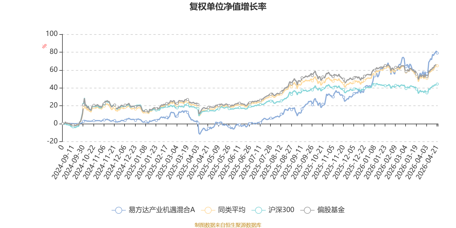 截至4月21日,易方达产业机遇混合A近三个月复权单位净值增长率为9.98%,位于同类可比基金90/689;近半年复权单位净值增长率为46.97%,位于同类可比基金24/689;近一年复权单位净值增长率为89.06%,位于同类可比基金58/685。
