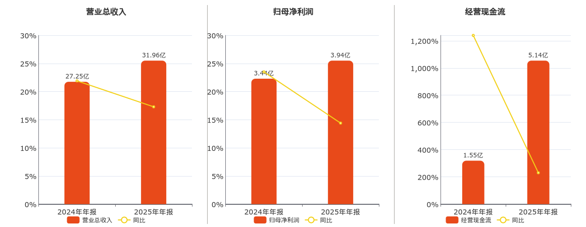 公司营业总收入为31.96亿元,在已披露的同业公司中排名第12。归母净利润为3.94亿元,在已披露的同业公司中排名第13。经营活动现金净流入为5.14亿元,在已披露的同业公司中排名第11。