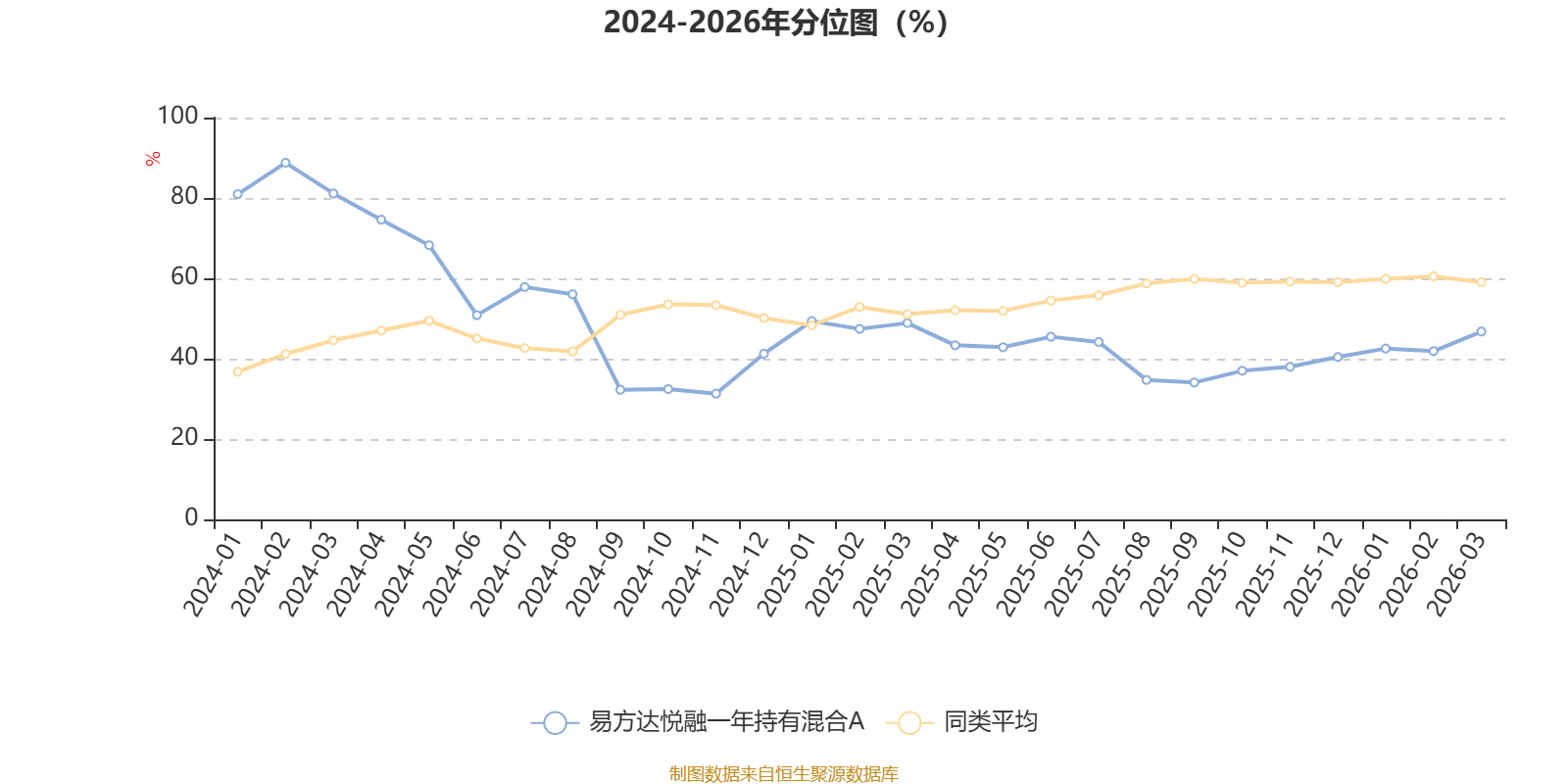 通过所选区间该基金净值增长率分位图,可以观察该基金与同类基金业绩比较情况。图为坐标原点到区间内某时点的净值增长率在同类基金中的分位数。