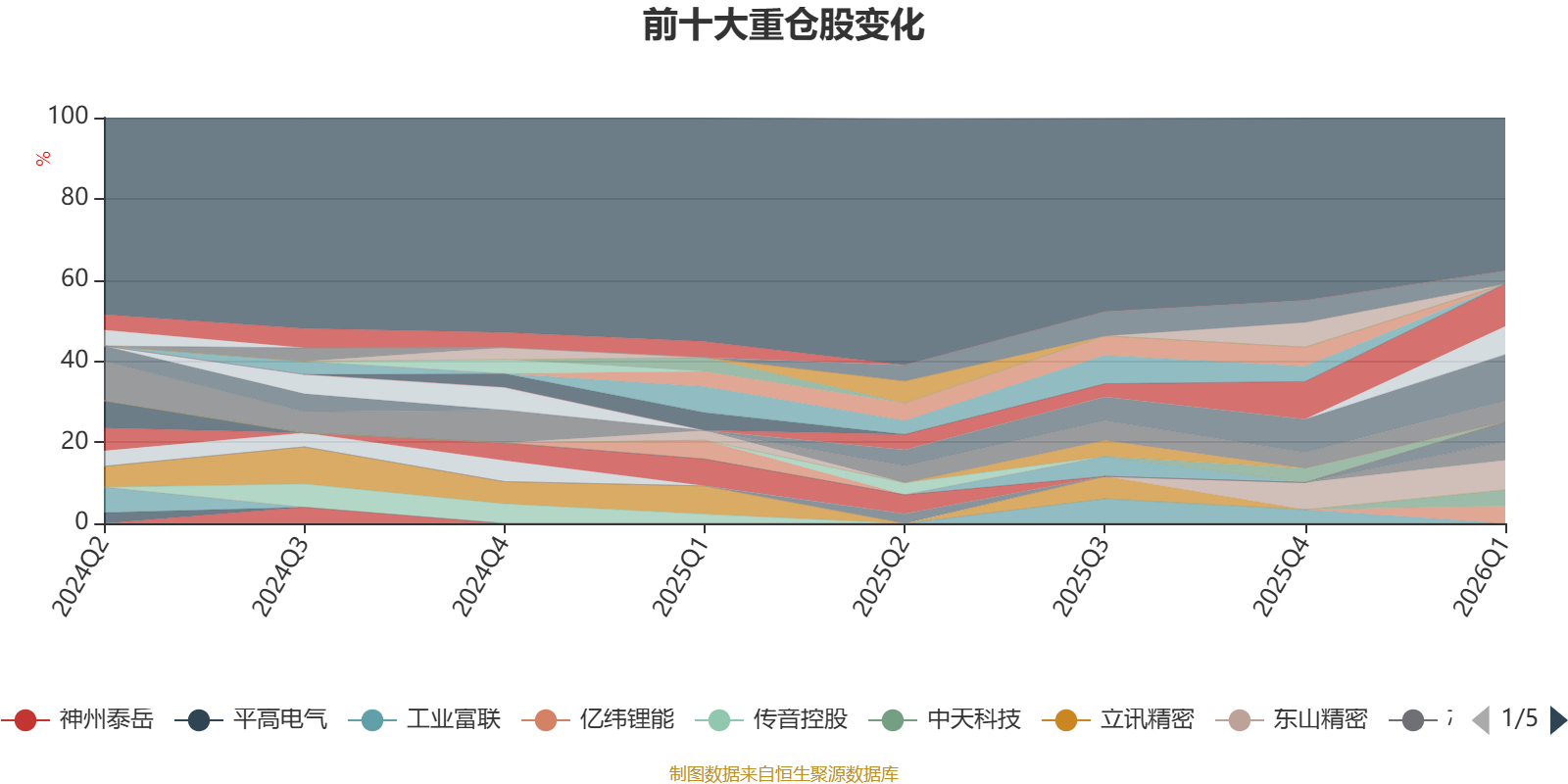 截至2026年一季度末,基金十大重仓股分别是新易盛、中际旭创、东山精密、亨通光电、沪电股份、长飞光纤光缆、芯原股份、亿纬锂能、中天科技、深南电路。