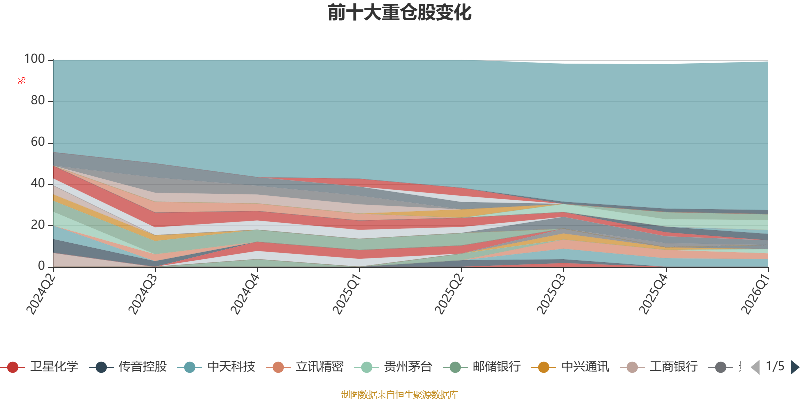 截至2026年一季度末,基金十大重仓股分别是宁德时代、中天科技、紫金矿业、瀚蓝环境、立讯精密、阿里巴巴-W、贵州茅台、中国平安、东阿阿胶、广钢气体。
