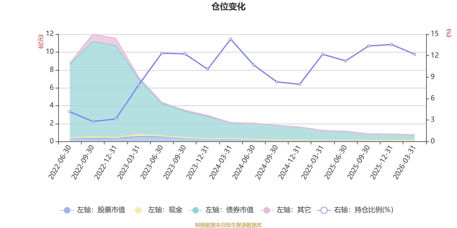 据定期报告数据统计,近三年平均股票仓位为11.55%,同类平均为19.02%。2024年一季度末基金达到14.31%的最高仓位,2022年三季度末最低,为2.8%。