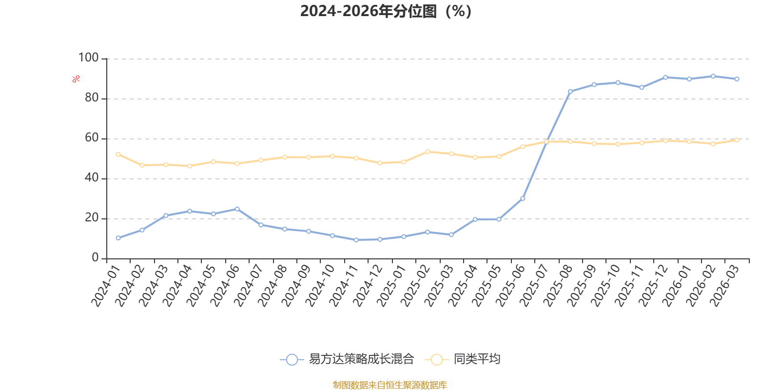 通过所选区间该基金净值增长率分位图,可以观察该基金与同类基金业绩比较情况。图为坐标原点到区间内某时点的净值增长率在同类基金中的分位数。