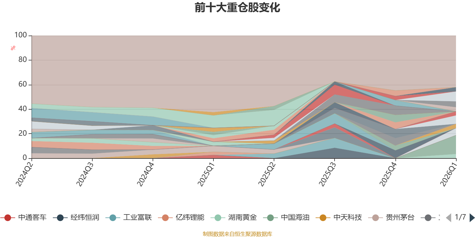 截至2026年一季度末,基金十大重仓股分别是中国海油、比亚迪、潜能恒信、温氏股份、南华期货、新疆天业、赤峰黄金、中控技术、湖南黄金、万凯新材。