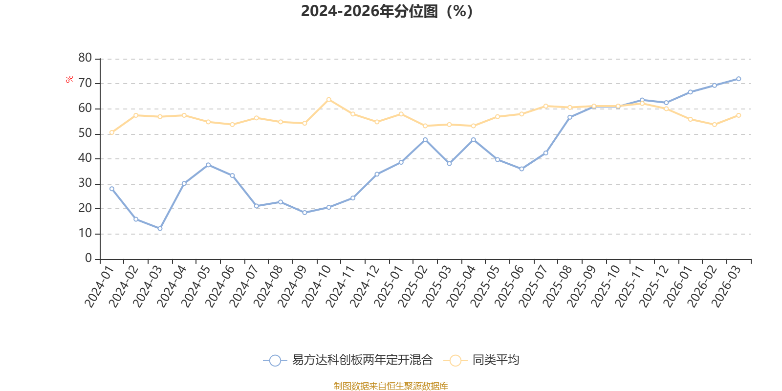 通过所选区间该基金净值增长率分位图,可以观察该基金与同类基金业绩比较情况。图为坐标原点到区间内某时点的净值增长率在同类基金中的分位数。